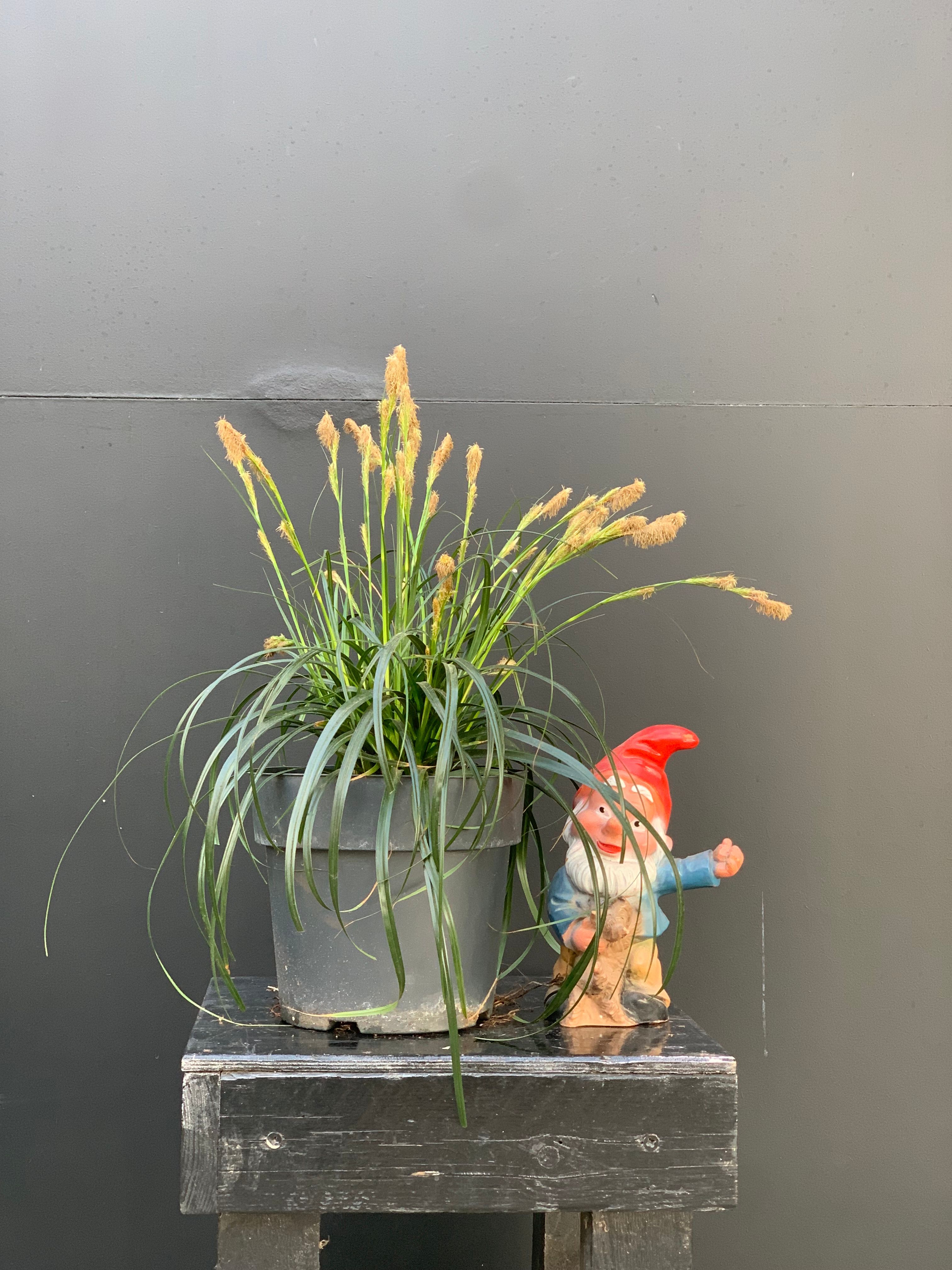 Carex oshimensis 'Ribbon Falls' is een sierlijke, siergras-achtige vaste plant die opvalt door zijn lang, elegant overloopend blad met een romig witte hart en glanzend donkergroene randen. Die waterval van blad geeft hem een bijna sculpturale uitstraling — prachtig in een pot, border of langs een vijverrand. Hij gedijt het best op een licht beschaduwde tot schaduwrijke plek — te veel directe zon kan het blad verbranden. Ideaal onder bomen of in een noordgerichte border. Ook als kuipplant op een beschut terras doet hij het uitstekend. Plant hem in vochtige, goed doorlatende, humusrijke grond. Regelmatig water geven is belangrijk, zeker in droge perioden. Hij is vrij winterhard maar verdient in strenge winters wat bescherming. Kam in het vroege voorjaar voorzichtig het oude blad uit met de vingers — knippen is zelden nodig. Weinig bemesting, een scheutje langzaamwerkende meststof in het voorjaar volstaat. Kortom: een elegante, onderhoudsarme plant met jaar rond decoratieve waarde.