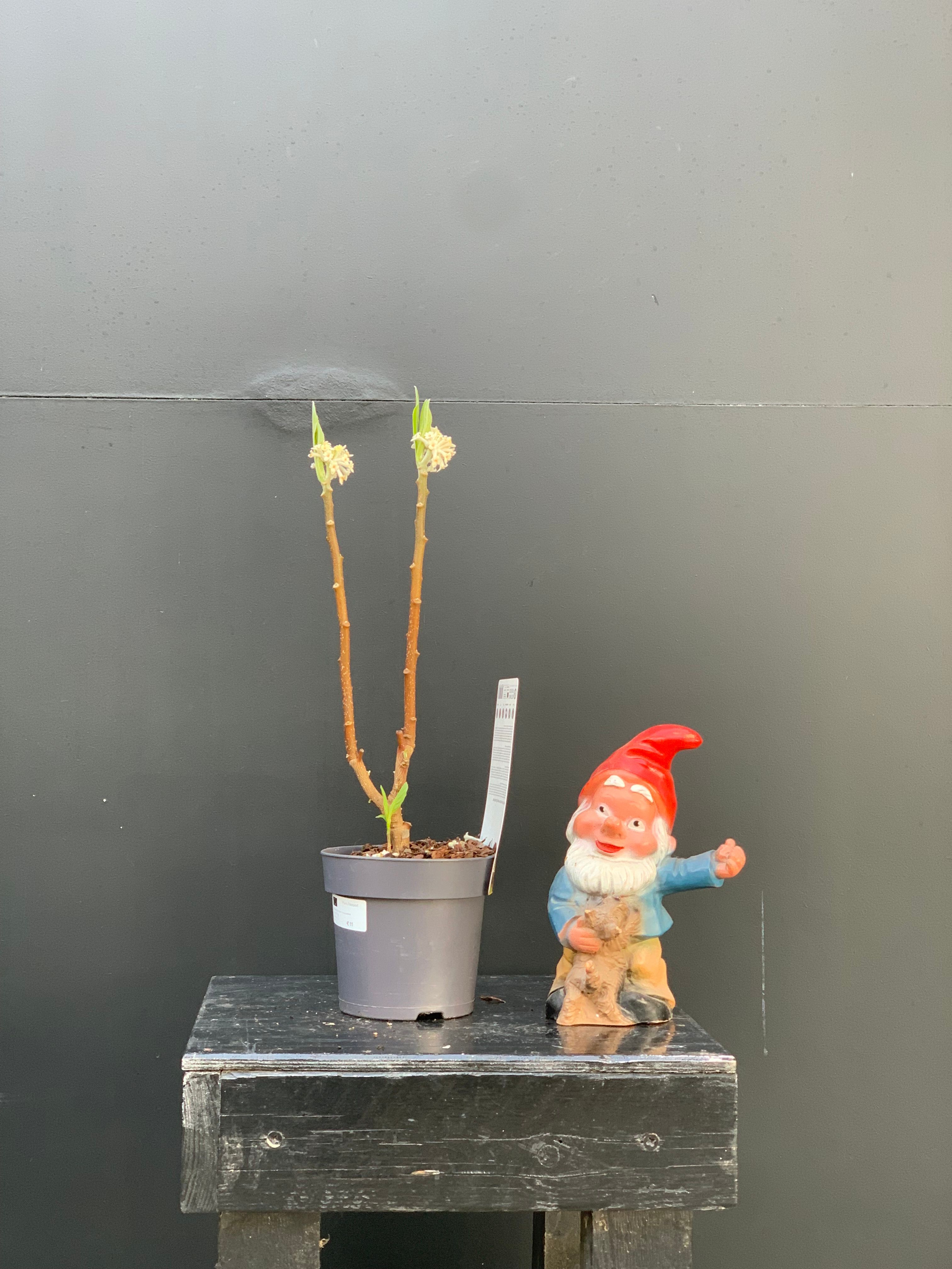 De papierstruik, zoals de Edgeworthia chrysantha in het Nederlands wordt genoemd, is een absolute blikvanger in de tuin. Deze bladverliezende struik is afkomstig uit China en Japan en behoort tot de familie van de Thymelaeaceae. Zijn naam dankt hij aan het feit dat zijn bastvezels van oudsher gebruikt werden voor de productie van papier en bankbiljetten in Japan. Wat deze struik echt bijzonder maakt, is zijn vroege bloei. Nog vóór de bladeren verschijnen, in februari tot maart, toont hij prachtige, ronde bloemtrossen van kleine, geurende, goudgele bloemetjes. De bloemen hangen sierlijk aan de soepele, kaneelkleurige takken en verspreiden een heerlijke, zachte geur. Later in het seizoen volgen grote, decoratieve bladeren. De papierstruik gedijt het beste op een zonnige tot halfschaduwrijke standplaats, beschut tegen felle, koude wind. De plant is matig winterhard.