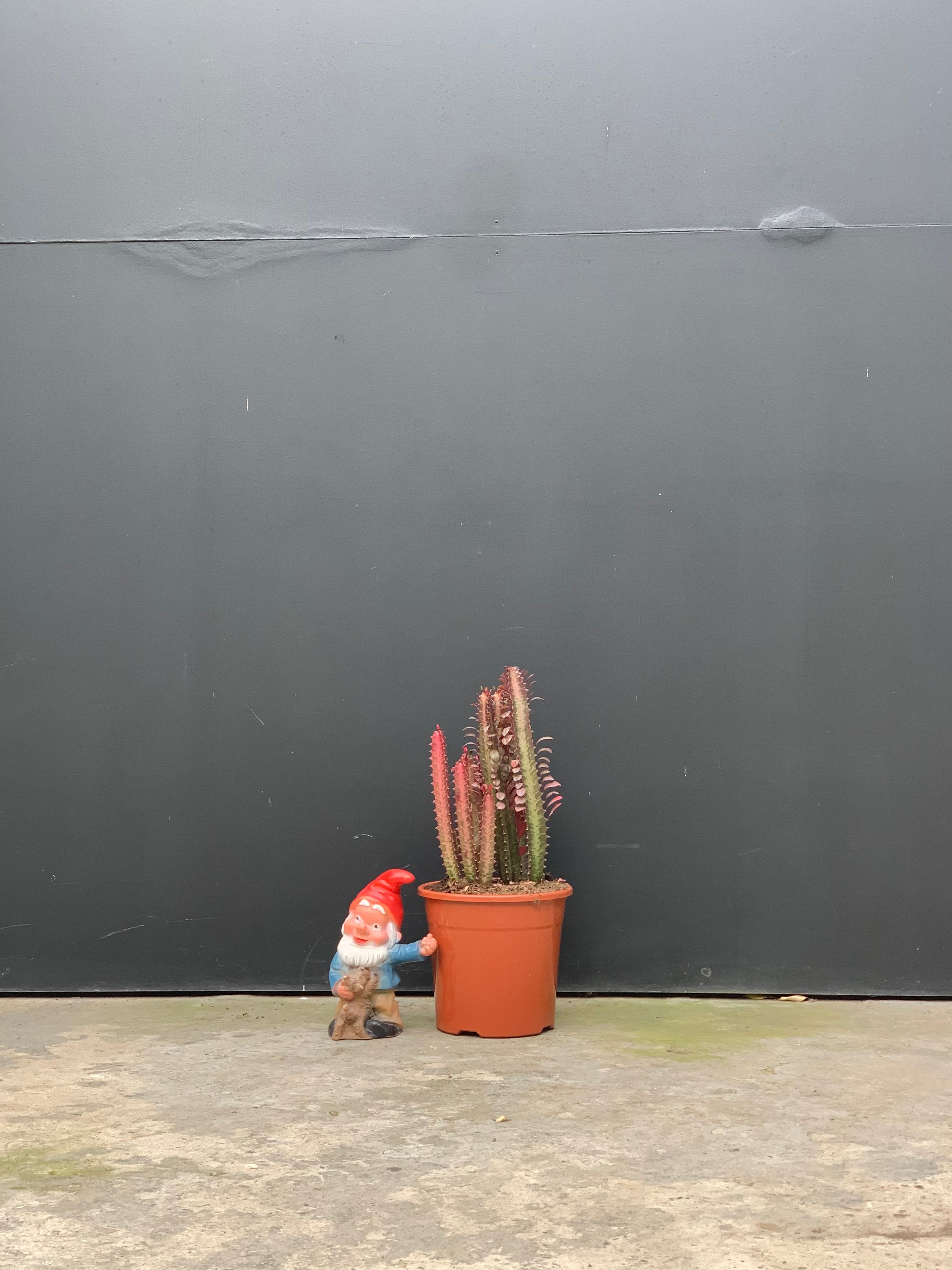 De Euphorbia trigona, ook bekend als de Afrikaanse melkboompje is een opvallende succulent die oorspronkelijk afkomstig is uit West-Afrika. Deze karakteristieke plant heeft een rechtopstaande, zuilvormige structuur met duidelijke ribben en kleine doornen langs de randen. Hoewel hij eruitziet als een cactus, behoort de Euphorbia trigona eigenlijk tot de wolfsmelkfamilie (Euphorbiaceae). De plant kan in zijn natuurlijke habitat tot wel 2-3 meter hoog worden, maar als kamerplant blijft hij meestal veel compacter. Hij heeft een opvallende groene kleur met soms bruinrode tinten aan de randen. De Euphorbia trigona is een relatief gemakkelijke kamerplant die weinig verzorging nodig heeft. Hij gedijt het best op een lichte, zonnige plek, maar kan ook goed tegen indirect licht. De plant houdt van droge omstandigheden en moet spaarzaam worden water gegeven om wortelrot te voorkomen.