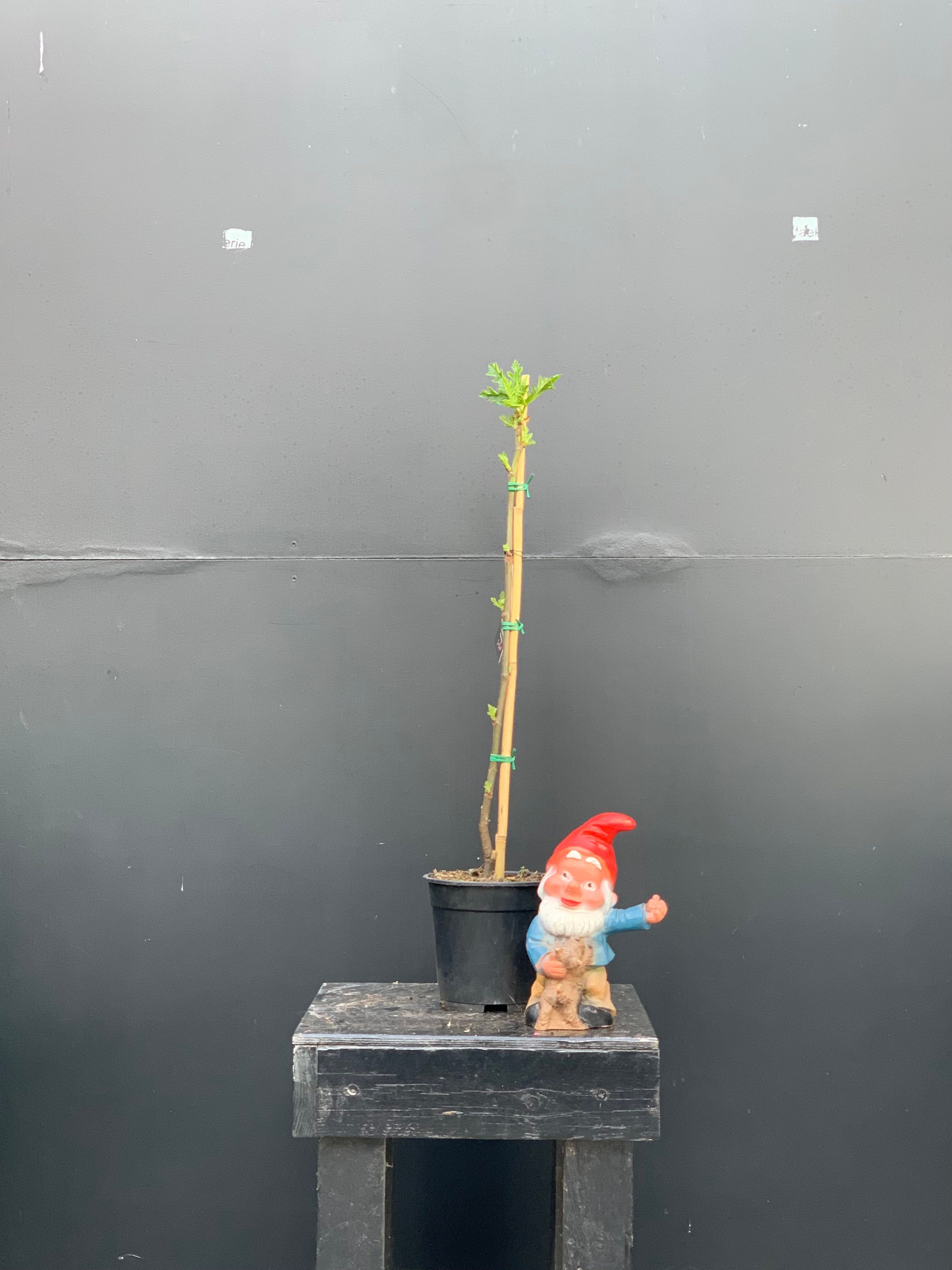 De Ficus carica 'Ice Crystal' is een bijzondere vijg die opvalt door haar diep ingesneden bladeren — ze lijken sprekend op ijskristallen. Vermoedelijk een hybride tussen Ficus carica en Ficus afghanistanica, combineert ze sierwaarde met een jaarlijkse vruchtproductie. Plant haar op een zonnige, beschutte plek met goed doorlatende grond. Een zuidgerichte muur is ideaal. Ze verdraagt droogte beter dan natte voeten, zeker in de winter. Snoei tweemaal per jaar: dode takken in het voorjaar, lange scheuten in de zomer. Haar winterhardheid tot -15°C maakt haar uitzonderlijk geschikt voor België. De zelfvruchtbare plant draagt ieder jaar kleine, donkerrode vijgen met zoetzuur vruchtvlees, rijp vanaf augustus. In een warme, zonnige tuin rijpen de vruchten vlot; in een koelere ligging is de oogst minder zeker. Vruchten die eind oktober nog niet rijp zijn, zullen het ook niet meer worden.