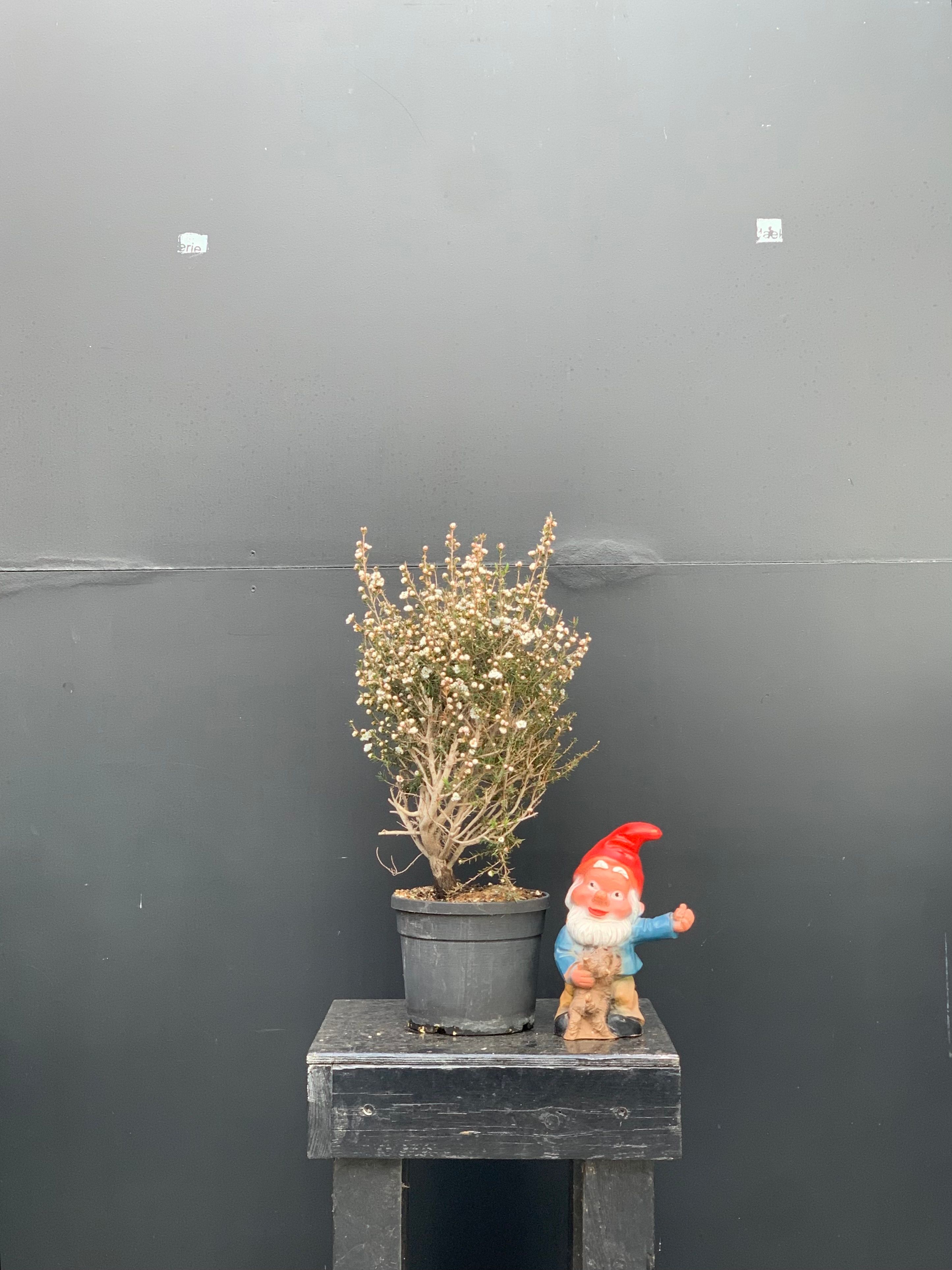 Een betoverende struik uit Nieuw-Zeeland en Australië, bedekt met een zee van kleine bloempjes in wit, roze of rood. De fijne, naaldachtige blaadjes geven hem een luchtige, elegante uitstraling het hele jaar door. In het voorjaar barst hij los in een overweldigende bloei die bijen en vlinders als een magneet aantrekt. Zonminnend en relatief droogtebestendig, maar helaas niet volledig winterhard in België — bij strenge vorst heeft hij wat beschutting nodig of overwintert hij best als kuipplant op een vorstvrije plek. Een absolute blikvanger op het terras of in de tuin met een mediterrane of exotische sfeer!