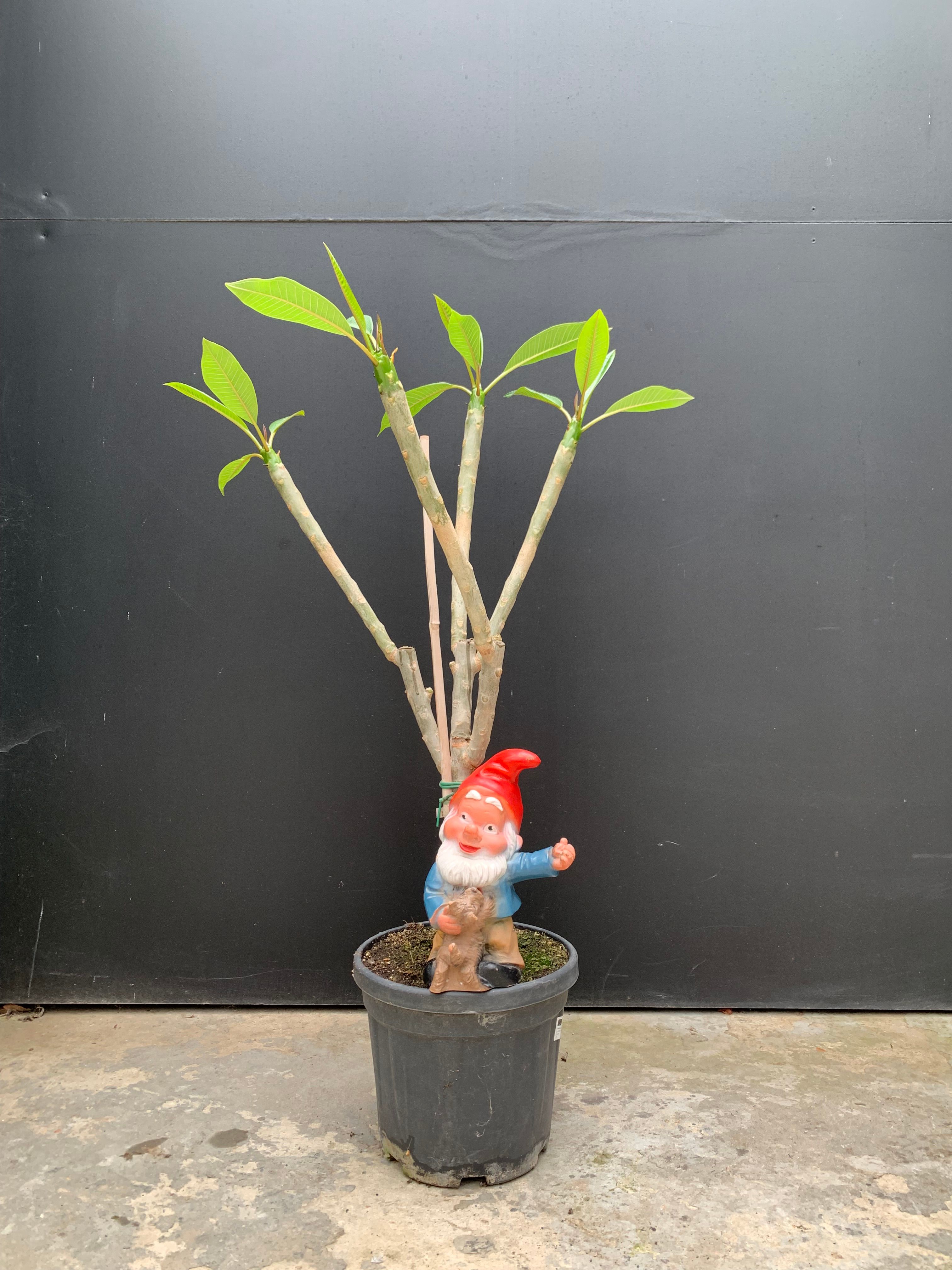 Plumeria, ook wel bekend als frangipani, is een prachtige en geurige bloeiende plant die inheems is in tropische gebieden over de hele wereld, waaronder Midden-Amerika, het Caribisch gebied, en delen van Azië. Deze plant staat bekend om zijn opvallende en kleurrijke bloemen, die vaak in tinten wit, geel, roze, rood, en oranje voorkomen. De bloemen hebben een kenmerkende vorm met vijf bloemblaadjes en verspreiden een heerlijke, bedwelmende geur, vooral 's nachts. Plumeria's gedijen goed in warme, zonnige klimaten en vereisen goed doorlatende grond. Ze worden vaak gekweekt als sierplanten in tropische en subtropische tuinen of als kamerplant gebruikt.